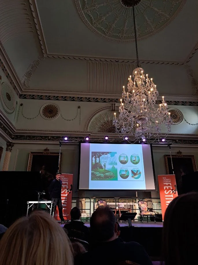 Author Peter Brown at the Bath Children's Literature Festival 2025 doing a live demonstration of drawing Roz the robot from The Wild Robot.
